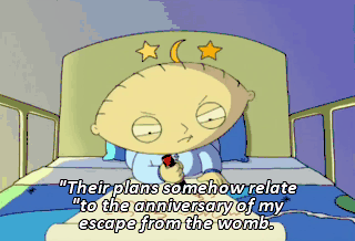 "Their plans somehow relate "to the anniversary of my escape from the womb. "I'm still haunted by the memories "of how I was incarcerated "in that amniotic Attica.