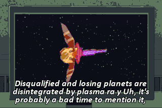Disqualified and losing planets are disintegrated by plasma ra y Uh, it's probably a bad time to mention it,