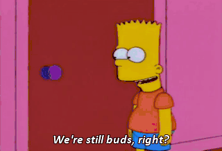 We're still buds, right? Okay, be that way! Be a big, stupid jerk! Oh! You're not the jerk. I am. Forgive me? Oh, like you're Miss Perfect! Mom, Lisa's making me feel bad!