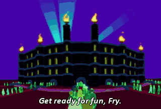 Get ready for fun, Fry. Nowadays we have a type of game played entirely on video. We call it a video game. A video game, you say? Well, golly gee.