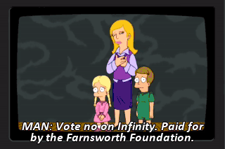 MAN: Vote no on Infinity. Paid for by the Farnsworth Foundation. We can't compete against that much stock footage of clouds!