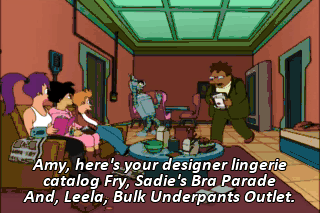 Amy, here's your designer lingerie catalog Fry, Sadie's Bra Parade And, Leela, Bulk Underpants Outlet.
