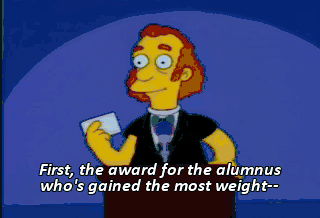 First, the award for the alumnus who's gained the most weight-- Homer Simpson! Oh, my God! How'd you do it, Homer? I discovered a meal between breakfast and brunch.