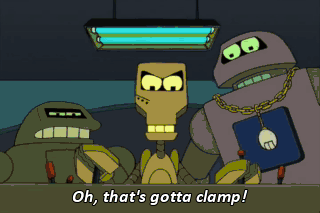 Oh, that's gotta clamp! Flexo, are-are you okay? Yeah. Never better. Nah, I'm yankin' your chain. I'm dyin'. You can't die! Tonight Bender showed me that I love you. But... I love you.