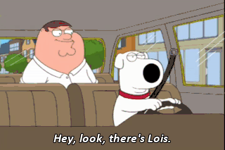 Hey, look, there's Lois. Yeah. Hey, honk the horn. (HORN HONKING) Oh, hi, Peter. (LAUGHING) Ram her. What? I said ram her!