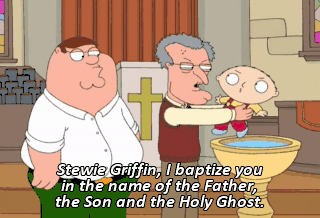 Stewie Griffin, I baptize you in the name of the Father, the Son and the Holy Ghost. And Space Ghost. What are you doing?