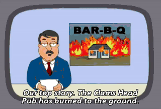 Our top story. The Clams Head Pub has burned to the ground. Our own Trisha Takanawa is on the scene. is quahog in the grip of a serial arsonist? Police say no, but our producer says yes.
