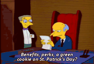 Benefits, perks, a green cookie on St. Patrick's Day? Oh-ho, it didn't use to be this way, Smithers. No, it didn't use to be this way at all.