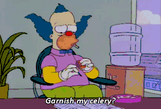 Garnish my celery? Please, Krusty. No jokes. Who's joking? Oh, I don't know what you're saying. It all sounds so crazy to me.