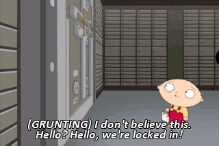 (GRUNTING) I don't believe this. Hello? Hello, we're locked in! (SNIFFING) Did you just crap your diaper? I got scared when the door closed.