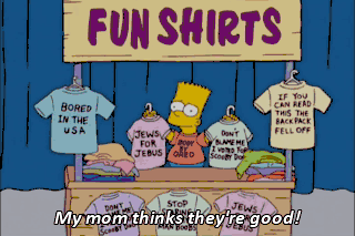 My mom thinks they're good! Y'all ready for this? (UPBEAT MUSIC PLAYING) Hey! Hey, hey! Krusty Show T-shirts are made for kids by kids! And we pass the "slavings" on to you! (CHUCKLING)