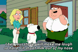 I bet your stories will make me laugh so hard, I'll shoot milk out of my nose.