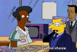 I'm sorry, Apu. I have no choice. You can no longer wear this name patch. And you can no longer tell people about our fried pickles. Now, turn in your pricing gun. Oh! The other one too.